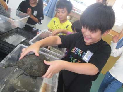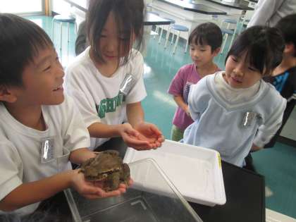 呉羽丘陵のホクリクサンショウウオをはじめ、様々な生き物をもってきて頂きました。実際に観察したり、触れ合ったりしました。