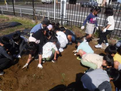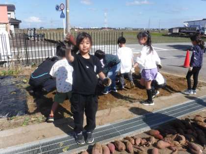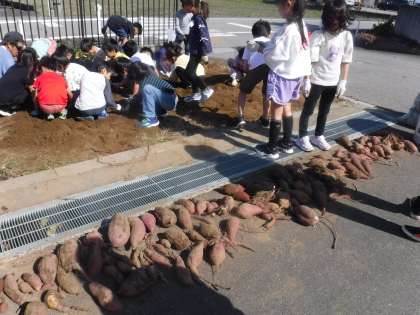 みんなで苗を植えて育ててきたサツマイモを収穫しました。予想以上にたくさんの収穫があり、大喜びの2年生です。