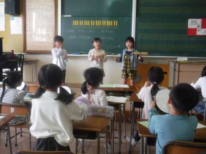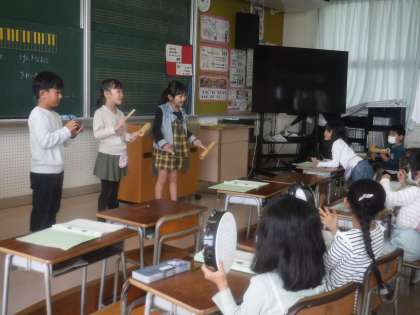 いろいろな音が出る楽器を使って演奏を楽しんでいました。グループごとにみんなの前で発表です。それを聞いている子供たちも一緒になって演奏を楽しみます。楽しいミニ演奏会になりました。