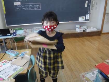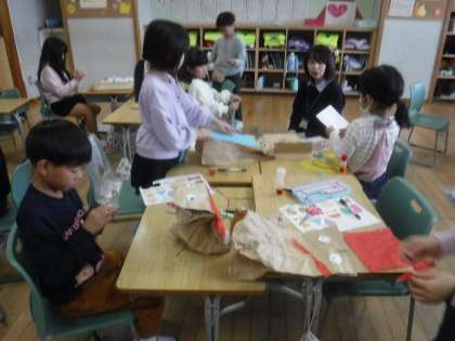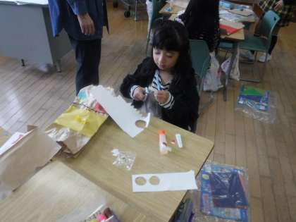 紙袋にいろいろな材料を工夫して貼り、楽しい「ぱくぱっくん」をつくる学習です。目を貼り、髪を付け、模様を考え、個性豊かなぱくぱっくんが出来上がってきました。