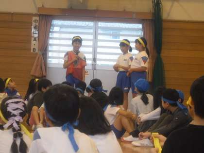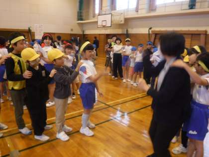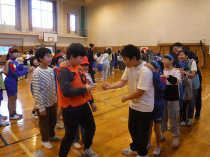 今日のふれあいタイムは、4年生が企画、運営を担当し、全校でじゃんけん列車をしました。最初はなかよし班のメンバーとじゃんけんをしながら列車をつくっていき、最後は全校で一つの列車になりました。先頭は1年生でした。終わりには感想を発表し合い、笑顔で1日をスタートさせました。
