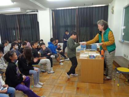 ガラス美術館に校外学習に行く4年生と、卒業制作でガラス工房に行く6年生が、イスラエル出身のガラス造形作家さんからお話を聞きました。ヘブライ語で名前を書いたものをプレゼントしもらったり、実際のガラスの作品を触ったり、貴重な経験をさせていただきました。4年生も6年生も次の学習に期待を膨らませていました。