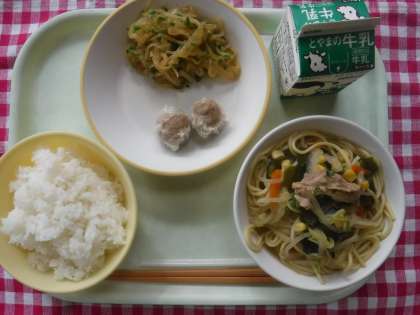 今日の給食の献立は、ごはん、牛乳、肉シューマイ、華風和え、わかめコーンラーメン でした。