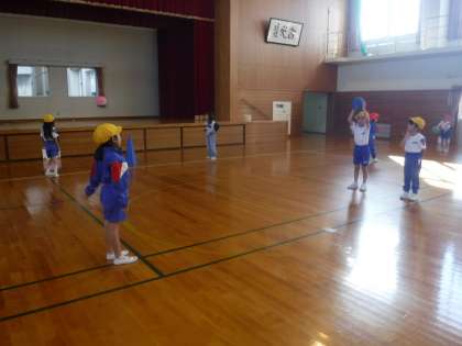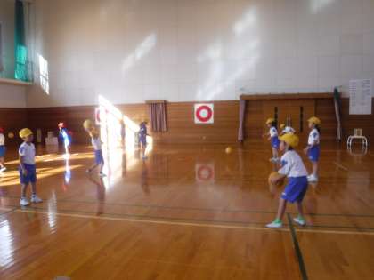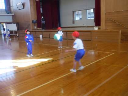ボールで段ボール箱の的を崩すシュートゲームに取り組んでいます。まずは、ゲームに必要な「技」を磨きます。ペアでキャッチボール。狙って投げられるように、確実に捕れるように、繰り返し練習します。