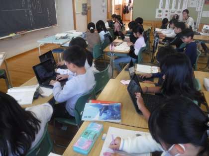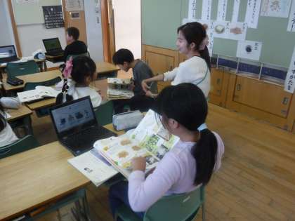 「すがたをかえる大豆」で学んだ説明する文を書く工夫を生かし、食べ物のひみつを伝える文章を書きます。まずは、何について書くのか決めます。自分が気になる食べ物について、本やインターネットから情報を探したり、先生や友達と対話したりしながら決めていました。