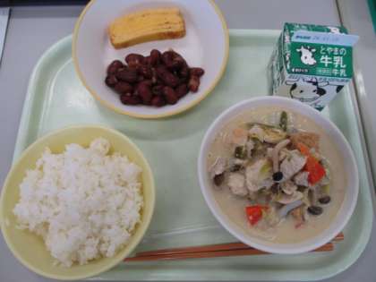 今日の給食の献立は、ごはん、牛乳、ごま豆乳鍋、煮豆、厚焼きたまごです。