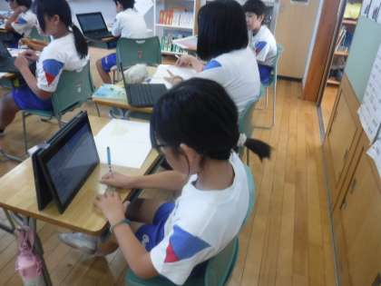 工芸品の魅力を伝える文章を書いています。自分が魅力を伝えたい工芸品について調べ、少しずつ付箋紙に情報を書いていきます。付箋紙を並べ替えながら、文章構成を考え始めている子供もいました。
