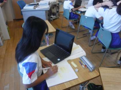 工芸品の魅力を伝える文章を書いています。自分が魅力を伝えたい工芸品について調べ、少しずつ付箋紙に情報を書いていきます。付箋紙を並べ替えながら、文章構成を考え始めている子供もいました。