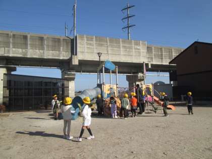 願海寺に住む友達が町自慢で紹介してくれた公園で、初めて来た子供たちも「きれいだね」「広いね」と話していました。広い公園で、元気にみんなで鬼ごっこを楽しみました。すぐ横に新幹線も通り、滞在中にも何度か見ることができました。