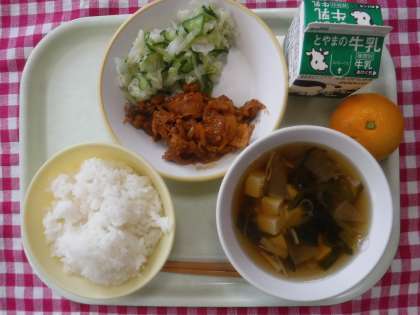 今日の給食の献立は、ごはん、牛乳、ぶた肉とレバーのケチャップソース炒め、すまし汁、そえ野菜、みかん でした。
