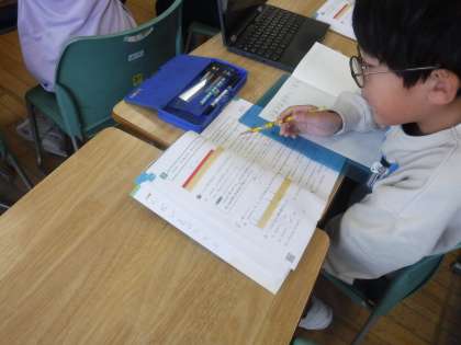 11月20日(水)3年生 算数科 公開日 2024/11/20 更新日 2024/11/20 3年生 小数の学習が始まりました。小数で表したかさや長さを、数直線で表すことについて考えていました。こうして、具体的な数を、一般的な数の概念で理解していきます。
