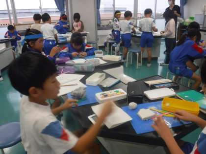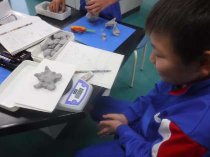 重さの学習です。同じ量の粘土の形を変えて、重さを量ります。形が変わったら重さは変わるのか、繰り返し確かめていました。