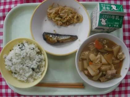 今日の給食の献立は、わかめごはん、牛乳、いわしの梅煮、いり大豆和え、ごまけんちん でした。