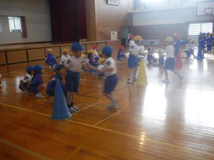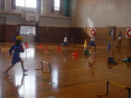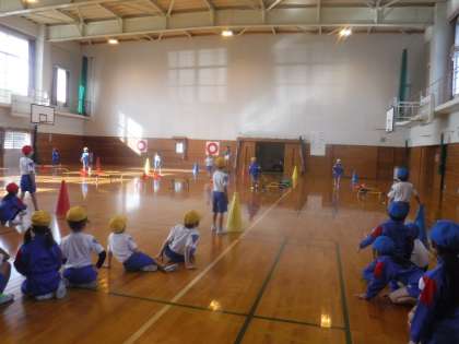 団対抗の折り返しリレーをしていました。行きは、いろいろな障害物を跳び越えながら走り抜け、帰りは歩いて戻ります。最初の場所に戻ったら、次の友達に確実にバトンを渡します。いろいろな身のこなし方が必要になってきますね。