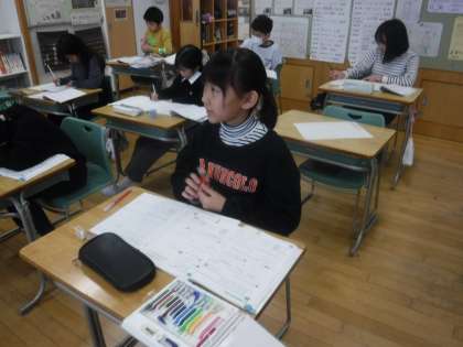 分数の足し算に取り組んでいました。まずは、どのように計算をすればよいか、自分の考え方をノートに書いていきます。その後、近くの人と考えを伝え合います。こうして「考える」ことを大切にしながら、思考力を育てていきます。