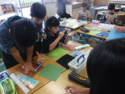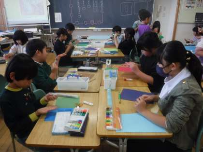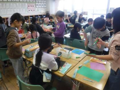 3年教室に入ると、みんな嬉しそうに手に絵の具を塗っています。聞くと、色画用紙に付けた手形を使って、みんなでクリスマスの飾りを作るとのこと。きっと素敵な飾りができあがることでしょう。仕上がりが楽しみです。