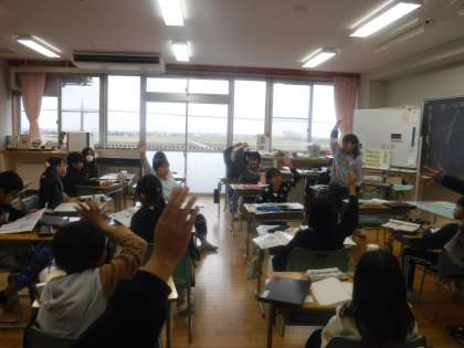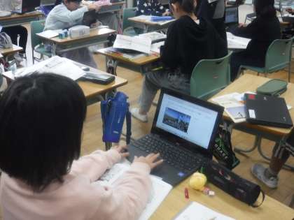 治水の歴史についての学習です。農作業で使う「くわ」についての発言を受け、「くわ」を知っているかどうか確かめ合いました。ここでクロムブックの登場です。インターネットで素早く検索し、動画資料を見ることで「くわ」を知らなかった子供も解決することができました。