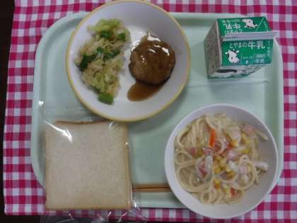 今日の給食の献立は、減量パン、牛乳、鶏つくね、切り干し大根のサラダ、クリームスパゲッティ でした。