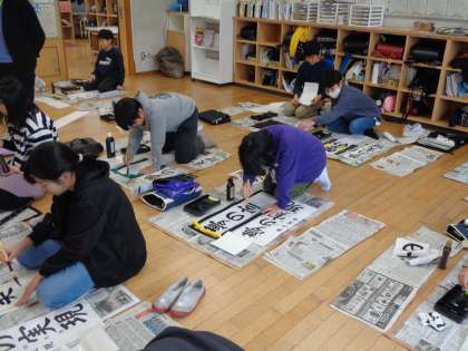 本番と同じように、床で書き初めの練習をしました。これまで、二字ずつ練習してきたので、全ての字を書くのは今日が初めてでした。「夢の実現」は字のバランスが難しいです。大きさや形に気を付けながらがんばっていました。