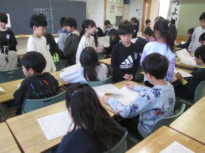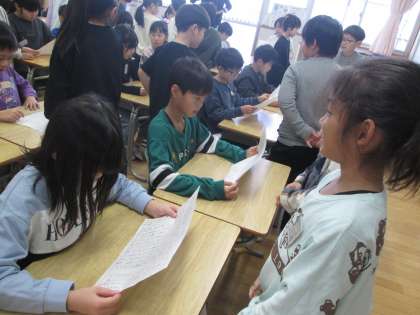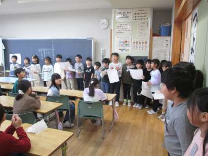 国語科「みきのたからもの」で学習した紹介文を3年生に読んでもらいました。「うまく書けているね」「わたしも読みたくなったよ」と言ってもらい、とても嬉しそうでした。