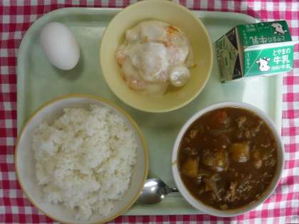 今日の給食の献立は、ごはん、牛乳、カレー、ゆで卵、フルーツヨーグルト でした。