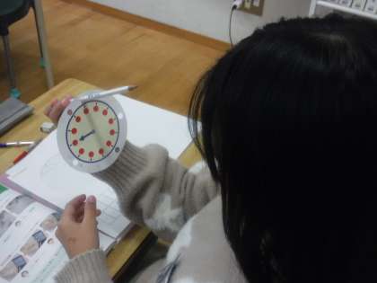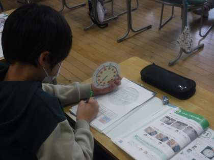 2つの数字の変わり方についての学習です。「雪が降る時間が長くなると、積もる雪の高さはどうなるか」など、生活の中での出来事を思い浮かべ具体的なイメージを広げていました。また、教科書に付いている「時計ばん」を使ったり、2つの数字の変わり方を表にまとめたりしながら考えていました。