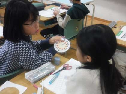 2つの数字の変わり方についての学習です。「雪が降る時間が長くなると、積もる雪の高さはどうなるか」など、生活の中での出来事を思い浮かべ具体的なイメージを広げていました。また、教科書に付いている「時計ばん」を使ったり、2つの数字の変わり方を表にまとめたりしながら考えていました。