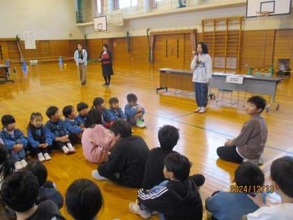 保育所の子供たちが安心して学校に来られるように、1年生になったらする勉強を一緒にしたいと、国語、算数、図画工作、体育、音楽の学習を企画しました。