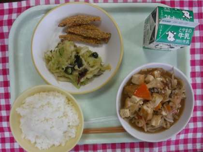 今日の給食の献立は、ごはん、牛乳、きびなごのさくさく揚げ、海藻サラダ、厚揚げの中華煮込み でした。