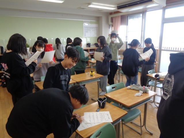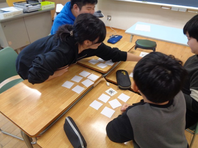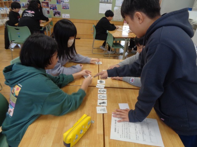 書初大会の後、学級活動で様々なゲームをして楽しみました。冬休みの様子を質問し合ったり、十二支を使って神経衰弱ゲームをしたりしました。