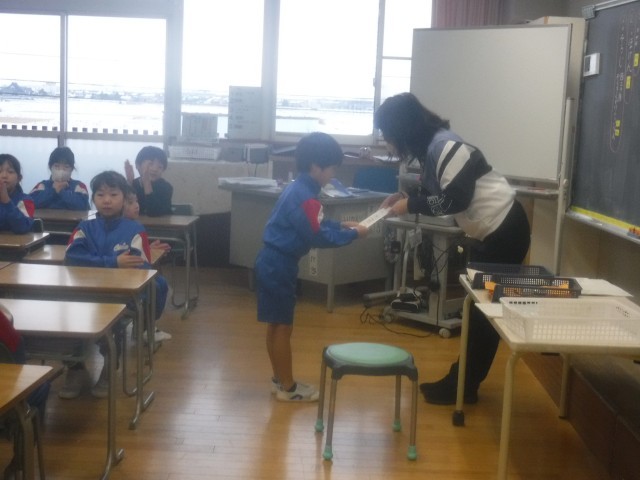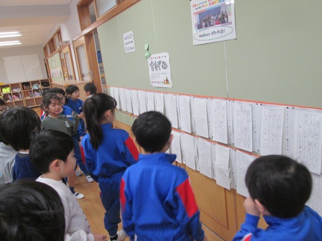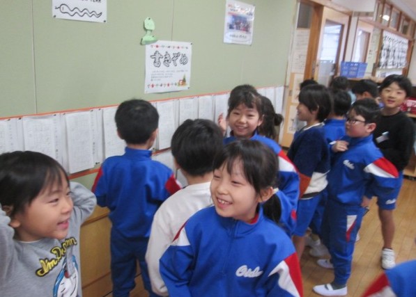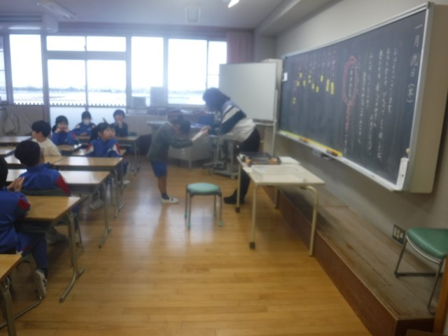 昨日行った校内書き初め大会の結果をみんなで確認しました。