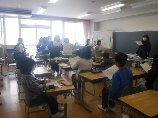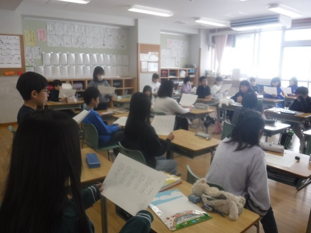 詩の音読をしていました。自分で読みたい箇所を選んで読む「たけのこ読み」です。全体の音読の流れに合わせて自分が選んだ箇所を読むので、集中したり、みんなと息を合わせたりすることが必要になってきますが、とても上手にできていました。