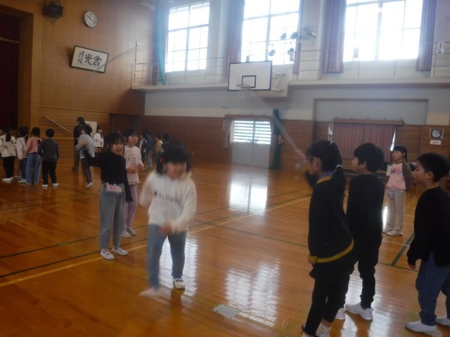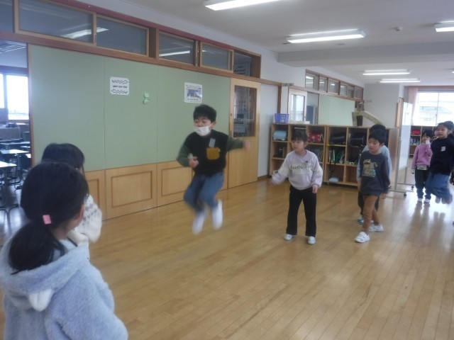 体力つくりは、縄跳び運動に取り組んでいます。まずは、大縄の8の字跳びの練習です。学年内でつくったチームで息を合わせて跳ぶ練習をがんばっていました。
