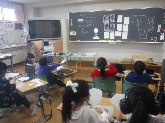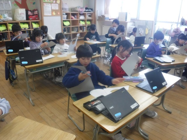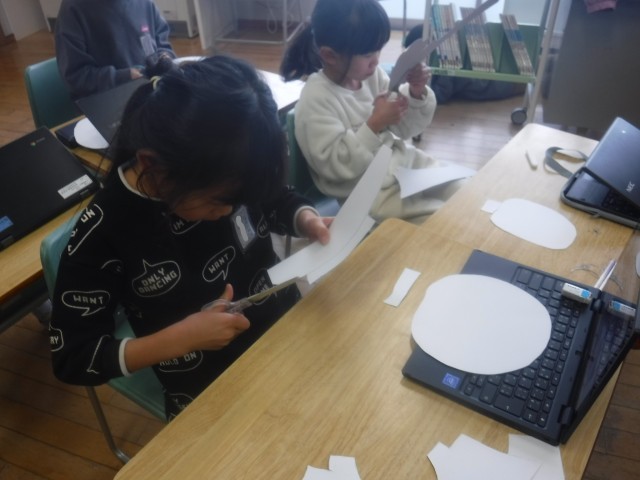 紙版画の学習が始まりました。題材は、「ぼく、わたしの かお」です。クロムブックで撮影した自分の顔の写真を見ながら、画用紙で版を作っていました。まずは顔の輪郭から。すでに、それぞれの個性が表れていました。