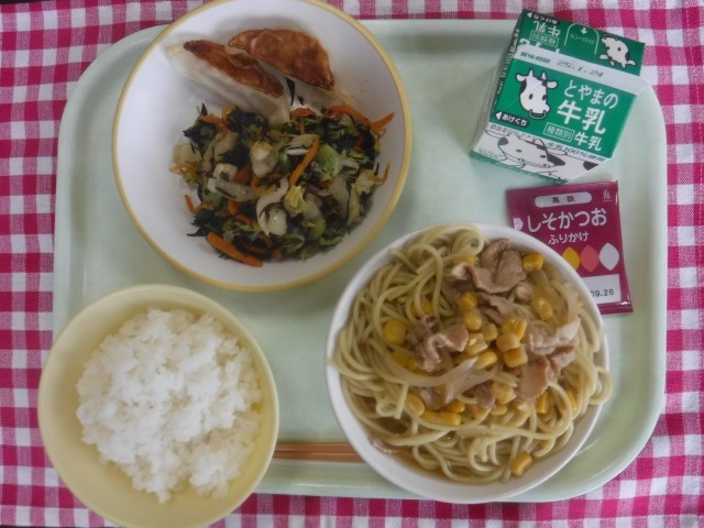 今日の給食の献立は、ごはん、牛乳、焼きぎょうざ、鉄たっぷりサラダ、サッポロラーメン、しそかつおふりかけ でした。
