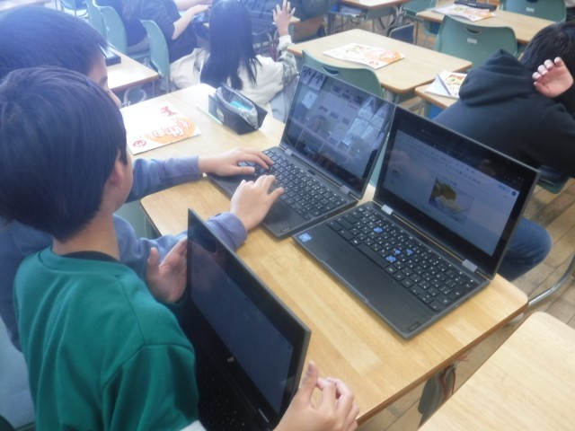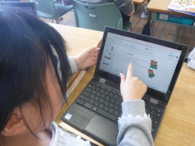 1月17日(金)3年生 総合的な学習の時間 公開日 2025/01/17 更新日 2025/01/17 3年生 自分で決めた「老田の すてき」を、スライドにまとめています。まとめながら、さらに必要な情報を調べている子供もいました。