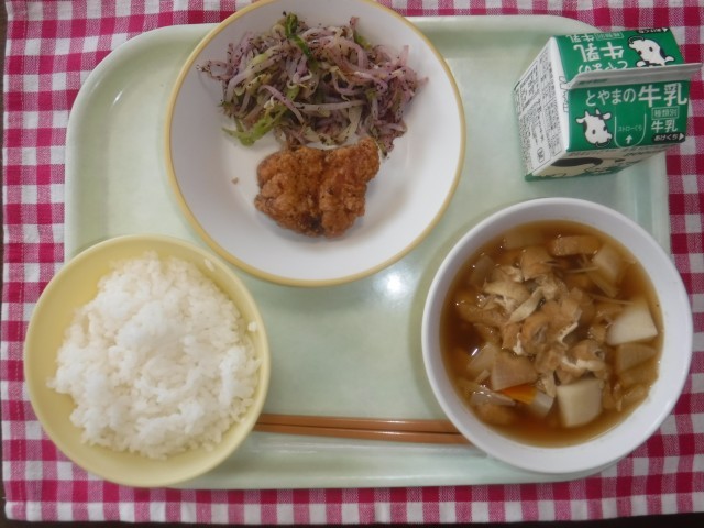 今日の給食の献立は、ごはん、牛乳、豚肉のかおり揚げ、梅肉和え、のっぺい汁 でした。