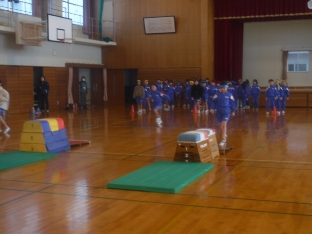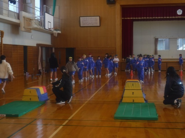跳び箱の学習が始まりました。けがをせず安全に活動できるよう、まずは、約束をしっかりと聞きます。その後、自分に合ったコースを選び、何度もチャレンジしていました。