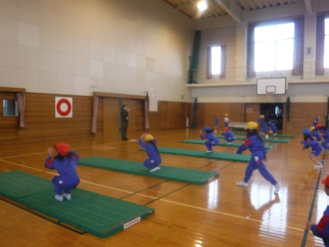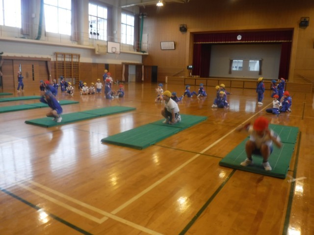 1月23日(木)1、2年生 体育科 公開日 2025/01/23 更新日 2025/01/23 1年生 マットを使った運動です。動物歩きの練習をしていました。ウサギ歩き(跳び)では、体をキュッと縮め、足を使って地面を蹴り力強く進んでいきます。