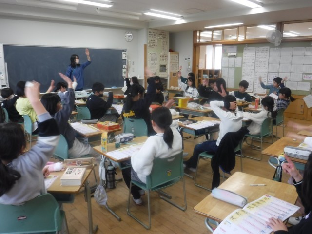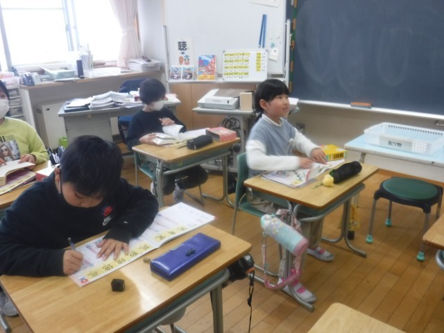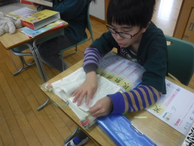 新出漢字の学習です。空書きでしっかりと書き順や形を確認してから、鉛筆を持ってスキルに本書きをしていきます。スキルに練習をし終えたら、熟語の意味を国語辞典で調べます。「調べた印」の付箋がたくさん付いている子がおり、これまでの学習の積み重ねが感じられました。