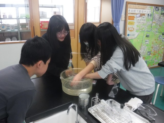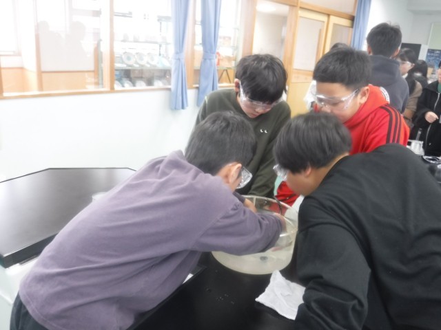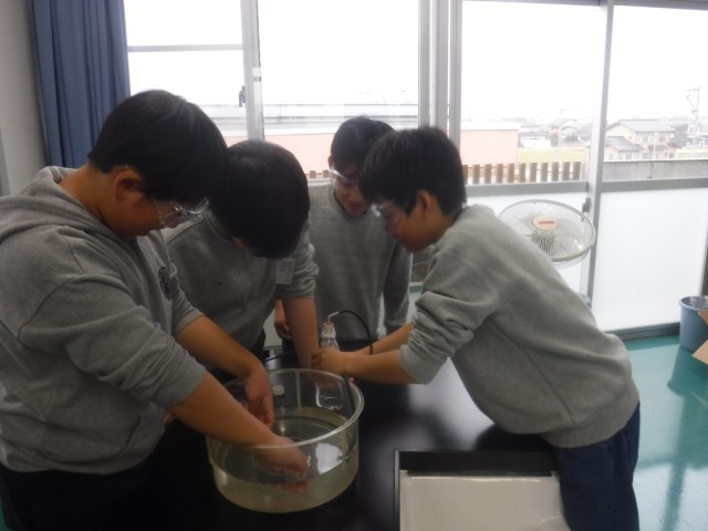 「炭酸水に溶けているものは何か」を確かめる実験をしました。今日は、呉羽中学校から理科の先生が授業参観に来ておられ、いつもよりも少し緊張しているように見える6年生でした。