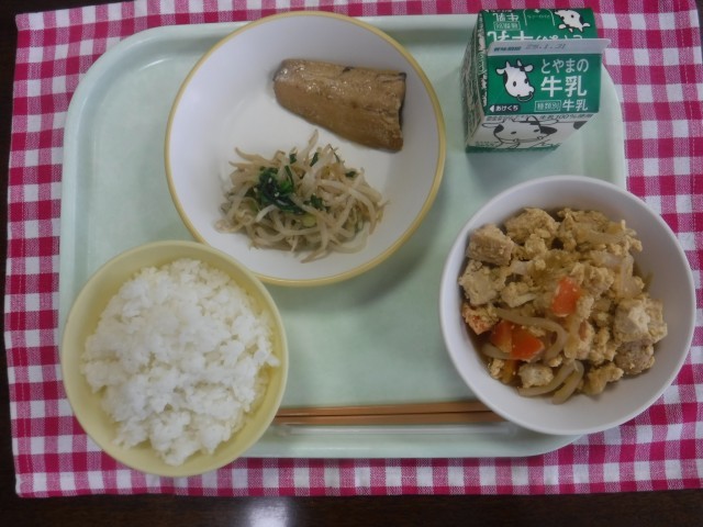 今日の給食の献立は、ごはん、牛乳、にしんのみぞれ煮、塩ナムル、親子煮 でした。