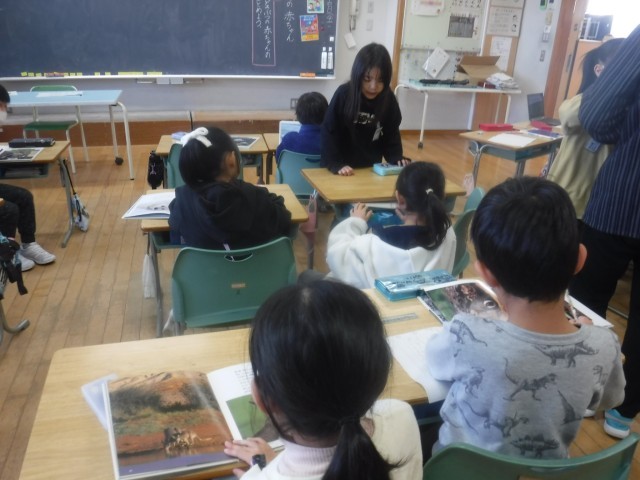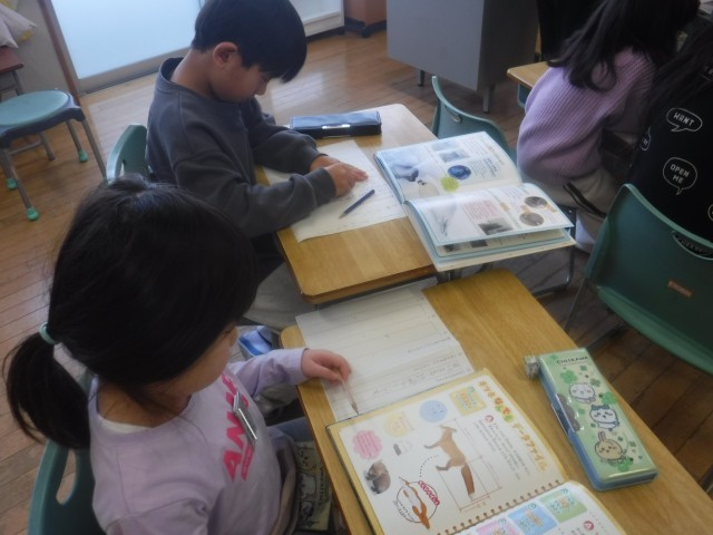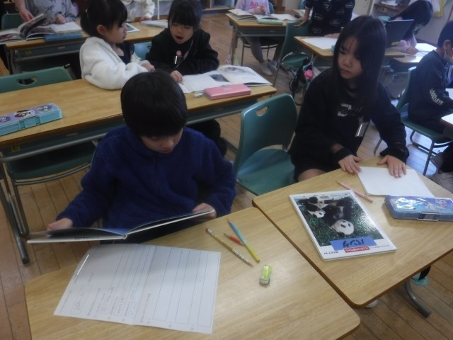 「どうぶつの赤ちゃん」で学んだことを生かし、自分たちでも他の動物の赤ちゃんについてのお話を書きます。まずは、図鑑で調べて分かったことを、ワークシートにまとめていました。