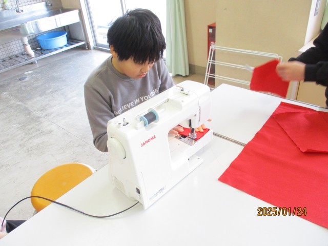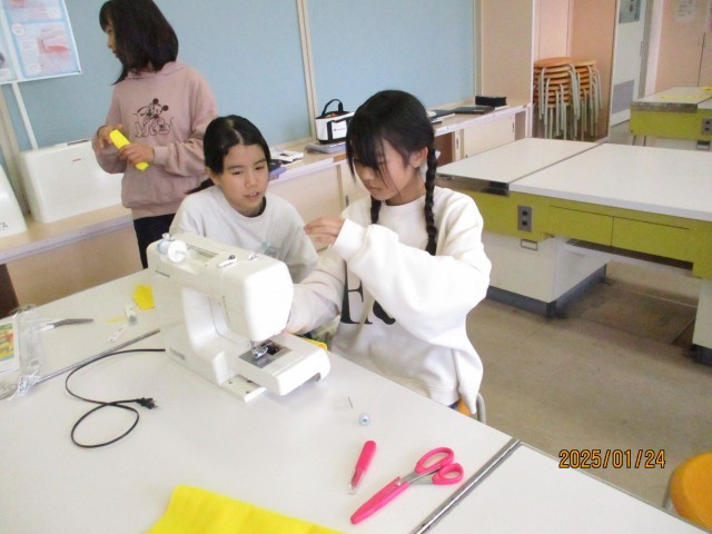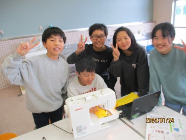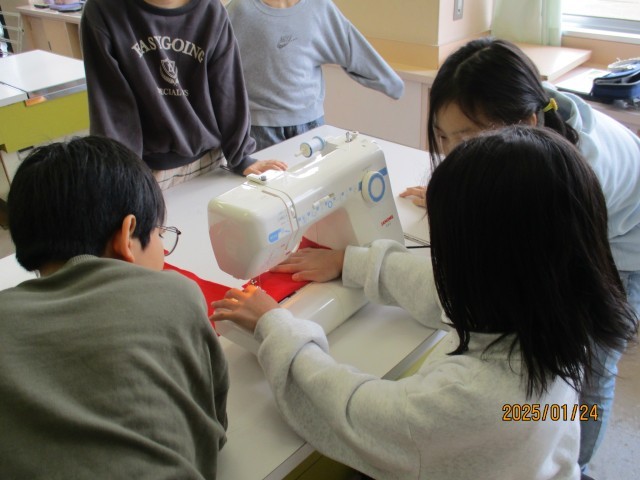 今日は家庭科の時間に初めてのミシンを使いました。上糸と下糸を、みんなで協力し合いながら設置し、上手に縫うことができていました。練習のために渡した布ですが、その布を使ってさっそく袋やリボンを作成している子供もいました。来週から始まるランチョンマット等の作品づくりが楽しみです。