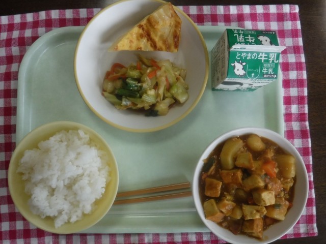 今日の給食の献立は、ごはん、牛乳、スパニッシュオムレツ、黄金比の野菜炒め、厚揚げのカレー味 でした。