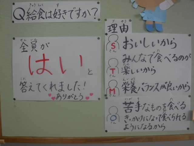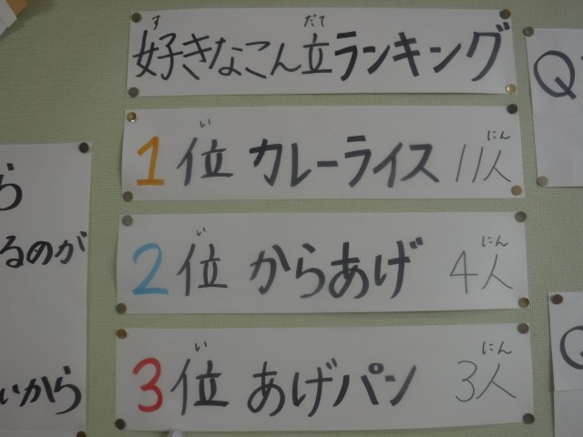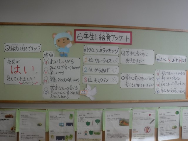 給食室近くの掲示が新しくなっていました。栄養職員が6年生に給食に関するアンケートをとり、作成してくれていたのです。「給食は好きですか」の問いに、全員が「はい」と答えてくれており、とても嬉しかったです。好きなメニューは、カレーライスがダントツの1位。今日の給食は、その、人気ナンバー1のカレーライスです。おいしくいただきましょう。