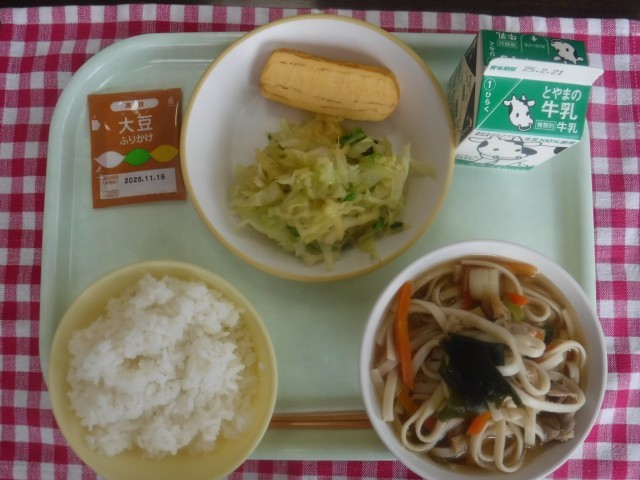 2月14日(金)今日の給食 公開日 2025/02/14 更新日 2025/02/14 本日の給食 今日の給食の献立は、ごはん、牛乳、厚焼き卵、あわせ和え、五目うどん、大豆ふりかけ でした。 五目うどんには、豚肉、しいたけ、人参、うす揚げ、わかめ、ねぎと、たっぷりの具が入っていました。お出汁は、かつお節と煮干し粉でとってあり、味わいも深かったです。