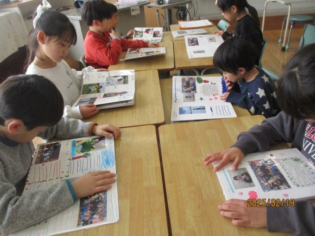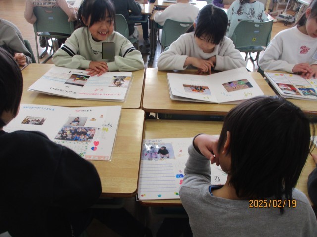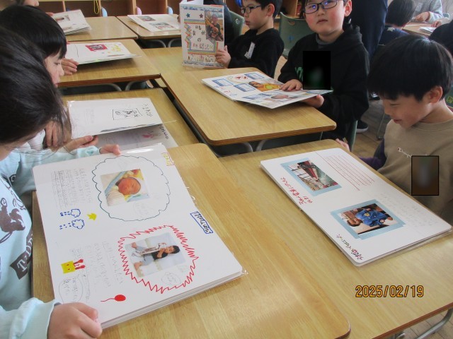 生活科「自分たんけん」の学習で、一人一人がこれまでの8年間をまとめた絵本を作り、完成した絵本を読み合いました。