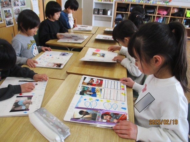 友達の成長の様子や出来事に「おもしろいね」「僕と一緒だ」「びっくりした」と感想を伝え合っていました。