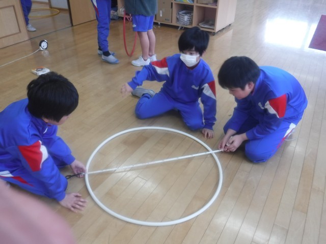 円の学習をしています。今日は、フラフープの回りの長さ(円周)を測っていました。